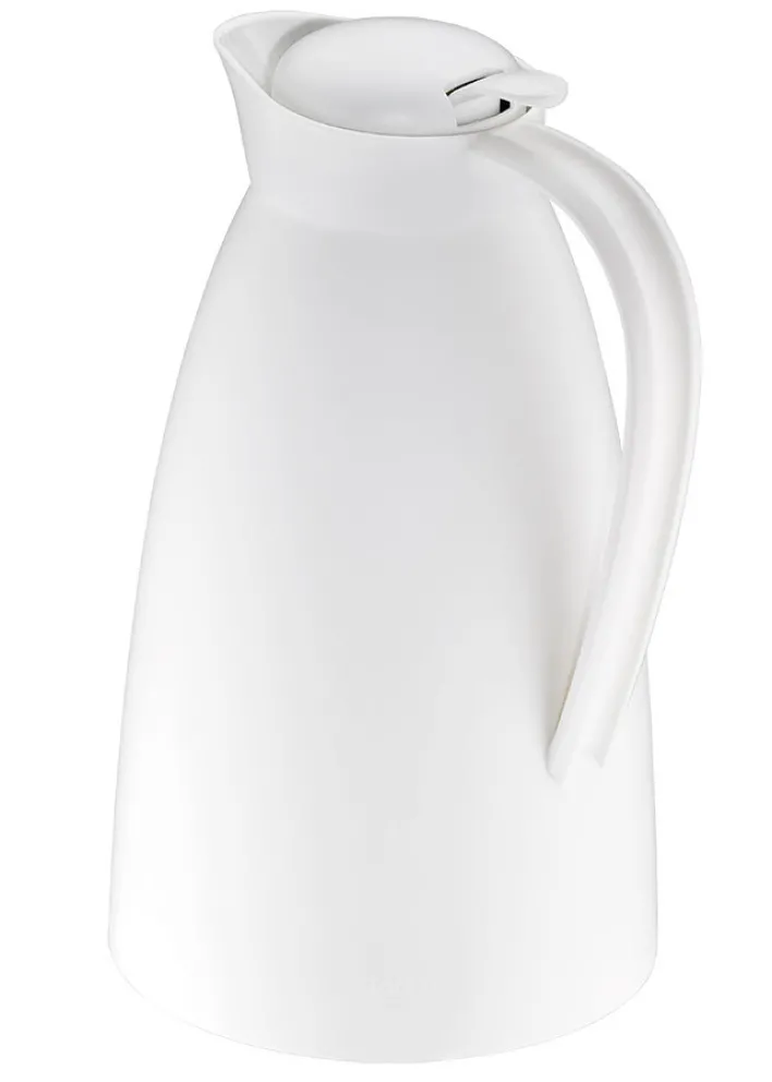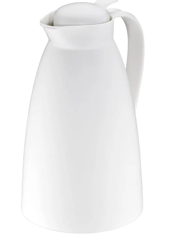 Diese schwarze Isolierkanne ECO aus pflegeleichtem Kunststoff mit der praktischen Einhand-Ausgießtaste ist mit einem Volumen von 1,0 Litern erhältlich.