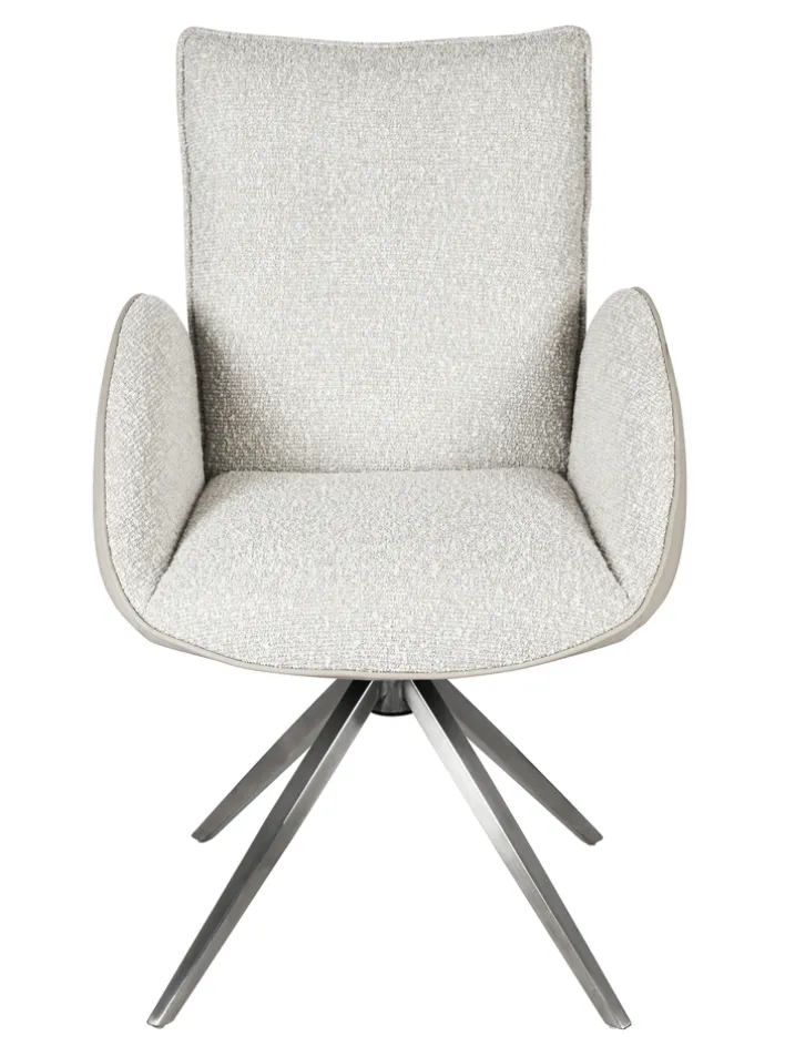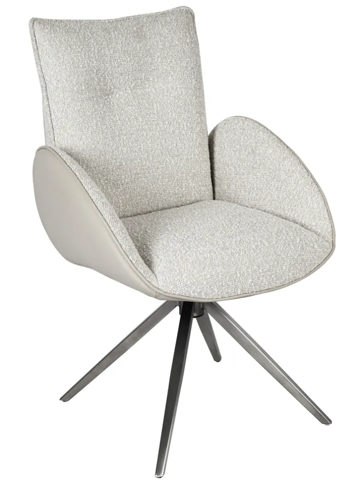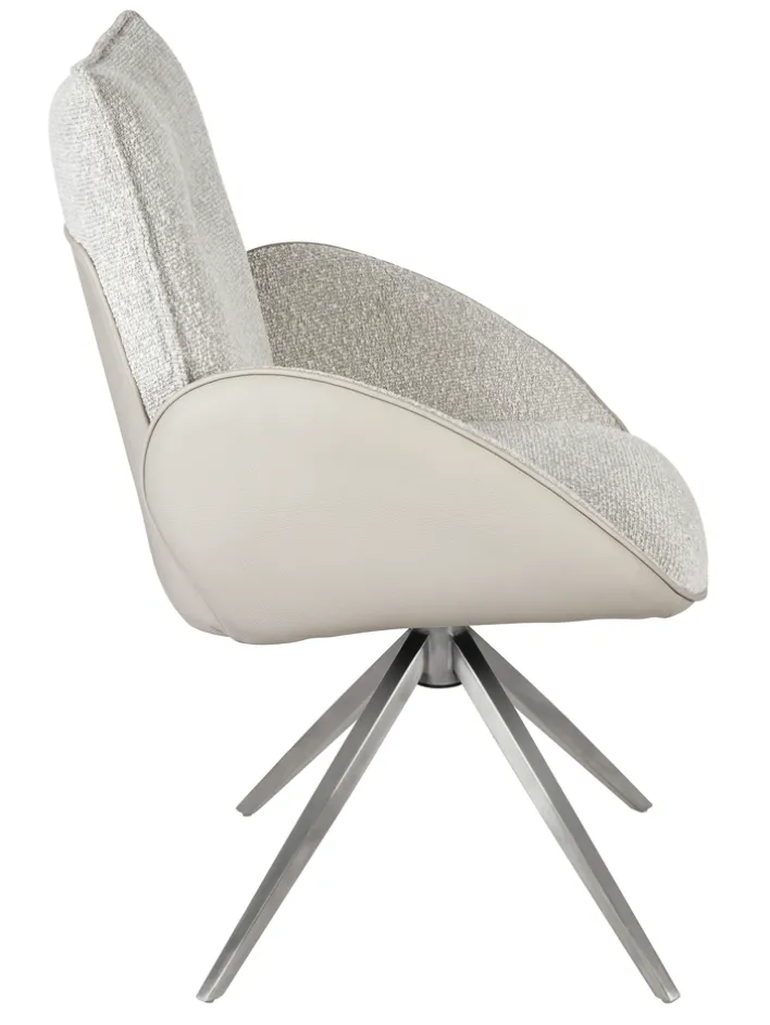 Der Armlehnstuhl aus der Serie BREST vereint modernes Design mit hochwertigen Materialien. Die Hauptfarbe Beige harmoniert perfekt mit den silberfarbenen Elementen, die dem Stuhl eine elegante Note verleihen. Der Bezug aus Leder und Textil bietet nicht nur eine ansprechende Optik, sondern auch hohen Sitzkomfort. Die klaren Linien und die ergonomische Form des Stuhls machen ihn zu einem idealen Möbelstück für jedes moderne Zuhause.