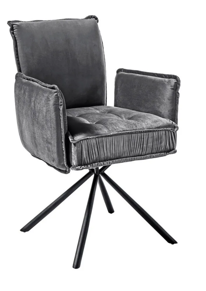 Der Armlehnstuhl INA besteht aus einem schwarz lackierten Spinngestell und einem komfortablen Sitz mit grauem Samtbezug. Mit der gepolsterten Sitzfläche sorgt der Stuhl auch bei längeren Familienfeiern für ein hohes Komfortgefühl. Ausgestattet mit Armlehnen ist der um 360 Grad drehbare Armlehnstuhl auch beim Aufstehen komfortabel. Das Highlight des Stuhls ist jedoch die Rückholfunktion durch die er automatisch wieder in seine Ausgangsposition zurückfällt. Durch sein stylisches Design macht der Armlehnstuhl im Esszimmer und im offenen Wohn-Essbereich eine gute Figur.
