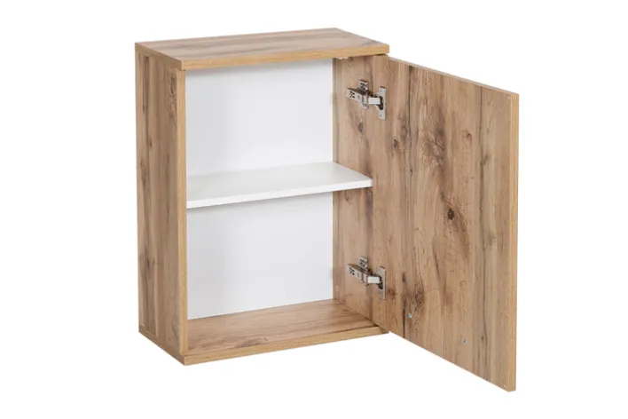 Der Schrank verfügt über eine Tür mit Soft-Close-Funktion, die ein sanftes und geräuschloses Schließen ermöglicht. Im Inneren befindet sich ein Einlegeboden, der für eine übersichtliche Aufbewahrung von Badutensilien sorgt. Der Schrank besteht aus Spanplatte, einem robusten Holzwerkstoff, der Langlebigkeit und Stabilität gewährleistet. Die klaren Linien und die funktionale Gestaltung machen diesen Hängeschrank zu einer praktischen Ergänzung für jedes Badezimmer.