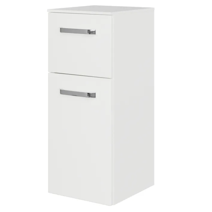 Das Highboard besteht aus einer Holznachbildung und verfügt über eine Tür und einen Schubkasten, die ausreichend Platz für Ihre Badutensilien bieten. Die klaren Linien und die schlichten Griffe unterstreichen das minimalistische Design, während die robuste Konstruktion für Langlebigkeit sorgt. Dieses Möbelstück ist ideal für alle, die Funktionalität und Stil in ihrem Badezimmer vereinen möchten.