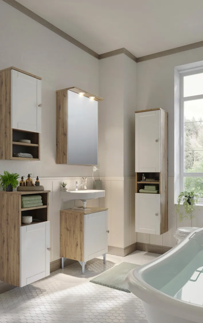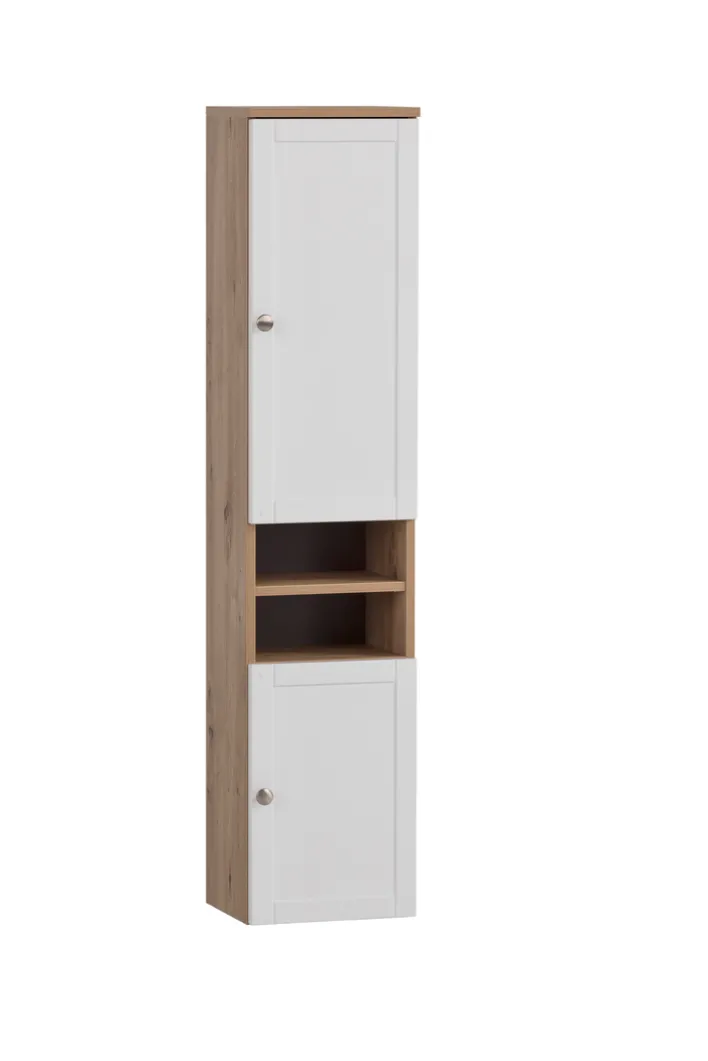 Die Griffe und Beschläge bestehen aus robustem Metall und die Artisan Eiche Dekorverkleidung weist eine fühlbare Holzstruktur auf. Der Bad-Hochschrank JESPER verfügt über großzügigen Stauraum mit zwei Türen. Drei höhenverstellbare Einlegeböden schaffen flexible Aufbewahrungsmöglichkeiten für Badaccessoires wie Handtücher, Waschutensilien und Reinigungsmittel. Zusätzlich gibt es zwei offene Regalfächer für den schnellen Zugriff auf oft benötigte Artikel. Mit seiner hängenden Montage spart der Schrank Platz und fügt sich harmonisch in jedes Badezimmer im Landhausstil ein.