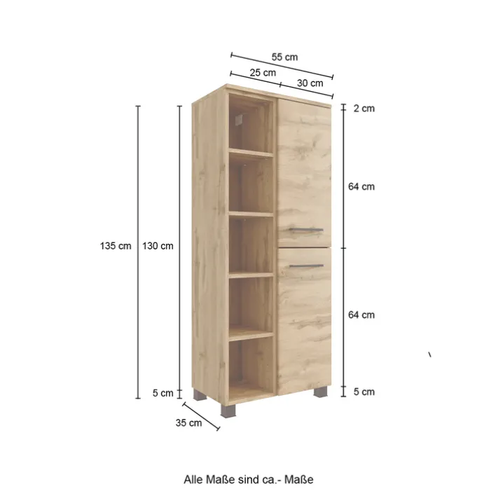 LIMBURG ist ein brauner, 130 cm hoher, 55 cm breiter und 35 cm tiefer Bad-Midischrank, der sich ungemein vielseitig nutzen lässt. Die stilvolle Verarbeitung in Wotaneiche Nachbildung verleiht ihm eine warme und heimelige Ausstrahlung.