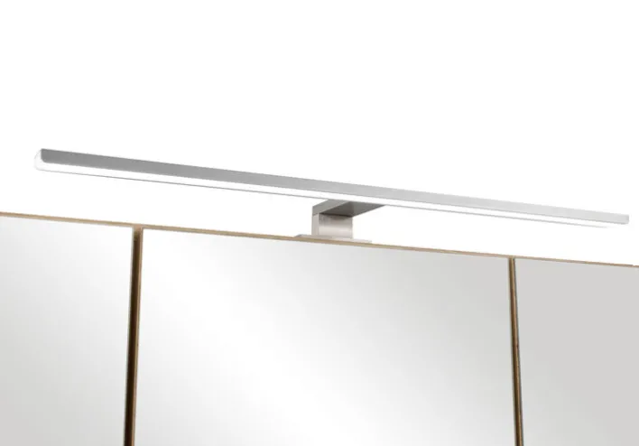 Der weiß-braune Bad-Spiegelschrank GENT ist 80 cm breit, 20 cm tief und 64 cm hoch. Ausgestattet mit einer LED-Aufbauleuchte in Edelstahloptik, punktet das Möbelstück durch viel Stauraum.