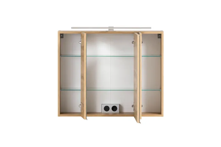 Der Bad-Spiegelschrank verfügt über drei Spiegeltüren. Im Inneren befinden sich hinter jeder Türe jeweils zwei Glaseinlegeböden für Bad-Utensilien. Diese sind höhenverstellbar. Der moderne Badschrank ist innerhalb des Korpus mit einer Steckdose sowie einem Lichtschalter ausgestattet. Hier ist es möglich, zum Beispiel einen Rasierer oder Föhn anzuschließen. Das gesamte Produkt besteht aus einer Holznachbildung. Als Dekorfarbe dient hier Eiche. Die Schrankvorderseite ist vollständig bespiegelt. Der Bad-Spiegelschrank GENT ist mit weiteren Produkten der Reihe kombinierbar.