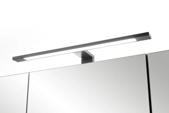 Der Spiegel wird mit einer modernen LED-Aufbauleuchte beleuchtet, was zu einer Höhe von 64 Zentimetern führt. Die drei Türen sind so angeordnet, dass beim Aufklappen ein 3D-Effet eintritt. Das macht vor allem das Frisieren wunderbar einfach.