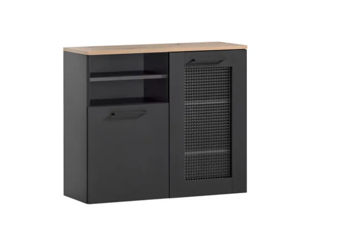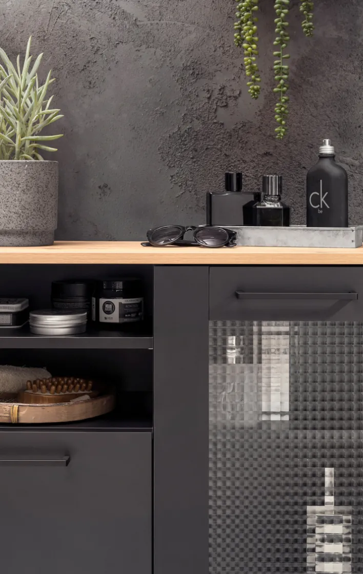Der Unterschrank Bad der Serie MALTE vereint modernes Design mit praktischer Funktionalität. Mit einer Breite von 80,4 cm, einer Höhe von 70 cm und einer Tiefe von 32 cm bietet er ausreichend Stauraum für diverse Badutensilien. Der Schrank ist in einem eleganten Schwarz gehalten, das durch die Holznachbildung der Oberseite einen stilvollen Kontrast erhält. Die Kombination aus offenen Fächern und Türen ermöglicht eine flexible Nutzung, wobei zwei Türen und zwei offene Fächer zur Verfügung stehen.