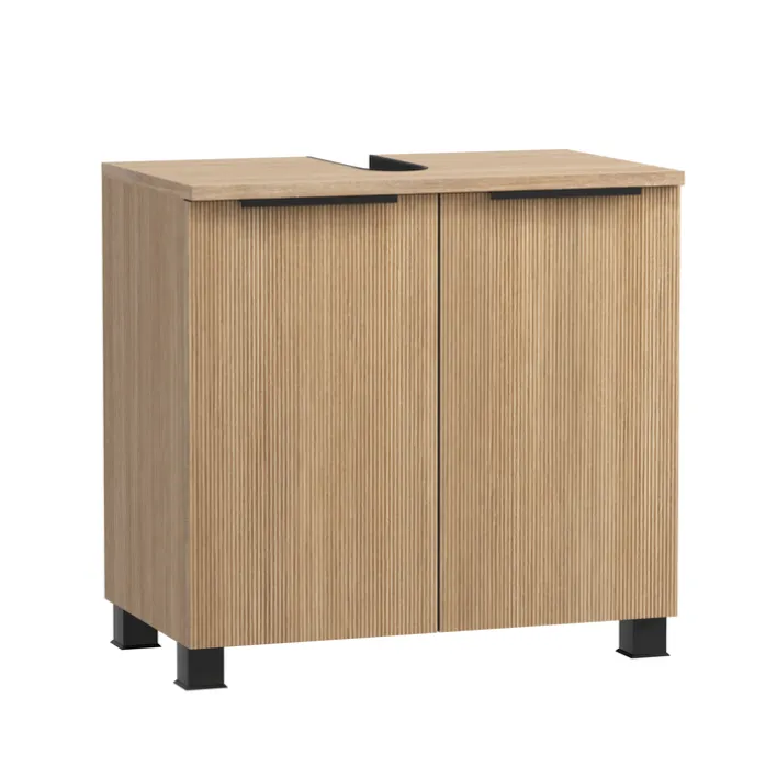 Dank der praktischen Ablageflächen und des großzügigen Stauraums ist dieser Waschbeckenunterschrank nicht nur funktional, sondern auch ein ästhetisches Highlight in jedem Badezimmer. Die stabilen schwarzen Füße sorgen für einen sicheren Stand und runden das Gesamtbild harmonisch ab.