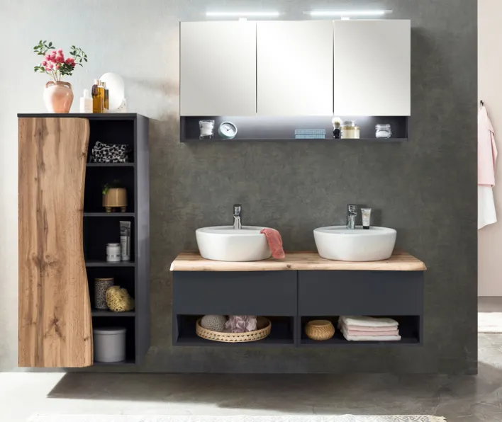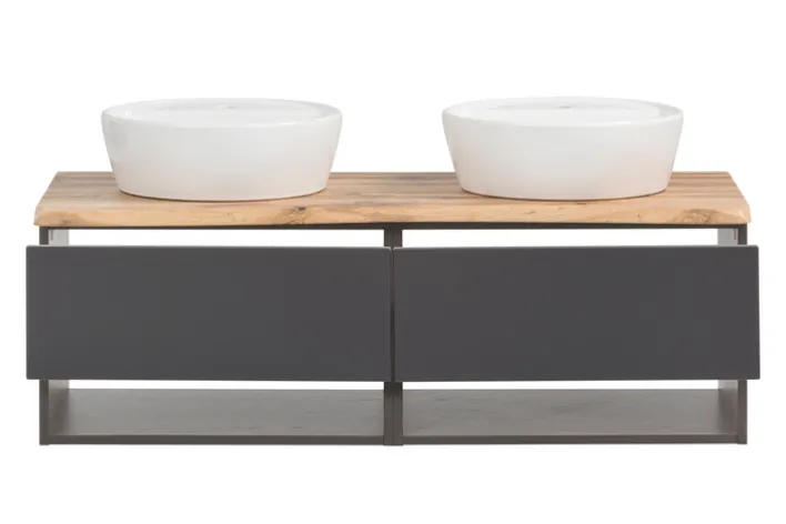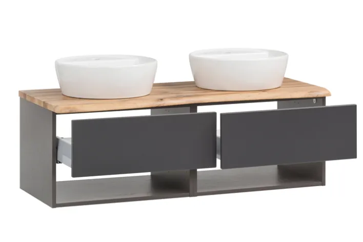 Der Bad-Waschtisch ANTWERPEN ist 121 cm breit, 54,5 cm hoch und 47 cm tief. Er ist aus Holznachbildung in Matt-Grau und Graphit und verfügt über 2 Keramikbecken.
