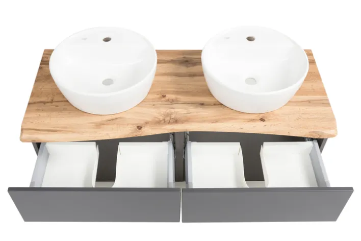 Doppelt schön, und das in jeder Hinsicht, ist dieser großzügig geschnittene Waschtisch aus der umfangreichen Badserie ANTWERPEN. Als besonderes Detail verfügt er über eine Abschlussplatte in Baumkantenform. Sie überzeugt nicht nur optisch durch den stimmigen Naturton, sondern auch durch die praktische, abgerundete Form. Zwei Schubkästen und zwei offene Fächer nehmen auf, was im Bad rasch zur Hand sein soll. Die hochwertigen Türen verfügen über Soft Close. Bitte Aufbauanleitung und Pflegehinweise am Artikel beachten.