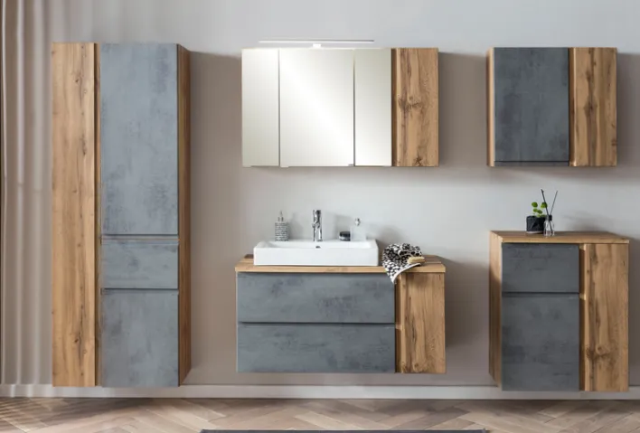 Es fällt sofort auf, dass das Waschbecken auf dem Unterschrank rechtsseitig anstatt mittig montiert ist. Das ist modern und betont das geradlinige Design der Eichen- und Betonoptik-Fronten. Die frei schwebende Montage lässt den 47 cm tiefen und inklusive Waschbecken 61.5 cm hohen Waschtisch noch eleganter wirken. Die Oberflächen sind selbstverständlich foliert, wodurch sie spritzwassergeschützt sind. Unter dem Waschbecken befinden sich zwei Schubkästen, die mit Ausschnitten für den Siphon versehen sind. Zusätzlichen Stauraum gibt es hinter der Drehtür, wo ein Einlegeboden das Fach unterteilt.