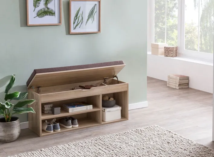 Dank der Bank wird das Aufräumen zum Kinderspiel. Drei offene Fächer im unteren Bereich bieten Platz für Schuhe oder Kartons, für dekorative Accessoires oder Zeitschriften. Beim Anheben der Sitzfläche öffnet sich ein weiteres Fach, in dem beispielsweise elektronische Geräte, Tagesdecken und Kissen, Handtasche oder Cityrucksack untergebracht werden können.