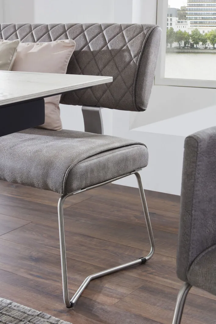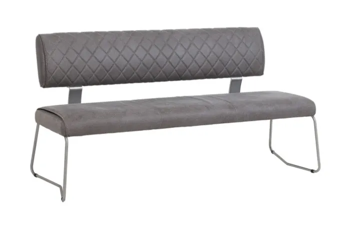Der Bezug der Sitzbank besteht aus 100 % Polyester, einer langlebigen Synthetikfaser, die in einem eleganten Grauton gehalten ist. Das gesteppte Muster auf der Rückenlehne verleiht der Bank eine stilvolle Note und sorgt für zusätzlichen Komfort. Die Kombination aus grauem Textil und silberfarbenem Metallgestell macht die Bank zu einem vielseitigen Möbelstück, das sich nahtlos in verschiedene Wohnstile integrieren lässt.