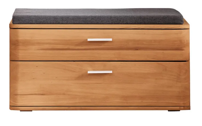 Das Design der Bank ist schlicht und modern, mit klaren Linien und einer glatten Oberfläche. Die Sitzfläche ist mit einem grauen Polster versehen, das für zusätzlichen Komfort sorgt. Die beiden Schubladen bieten praktischen Stauraum für verschiedene Gegenstände und sind mit eleganten, silberfarbenen Griffen ausgestattet. Diese Bank eignet sich ideal für den Einsatz im Flur, Wohnzimmer oder Schlafzimmer und fügt sich nahtlos in verschiedene Einrichtungsstile ein.
