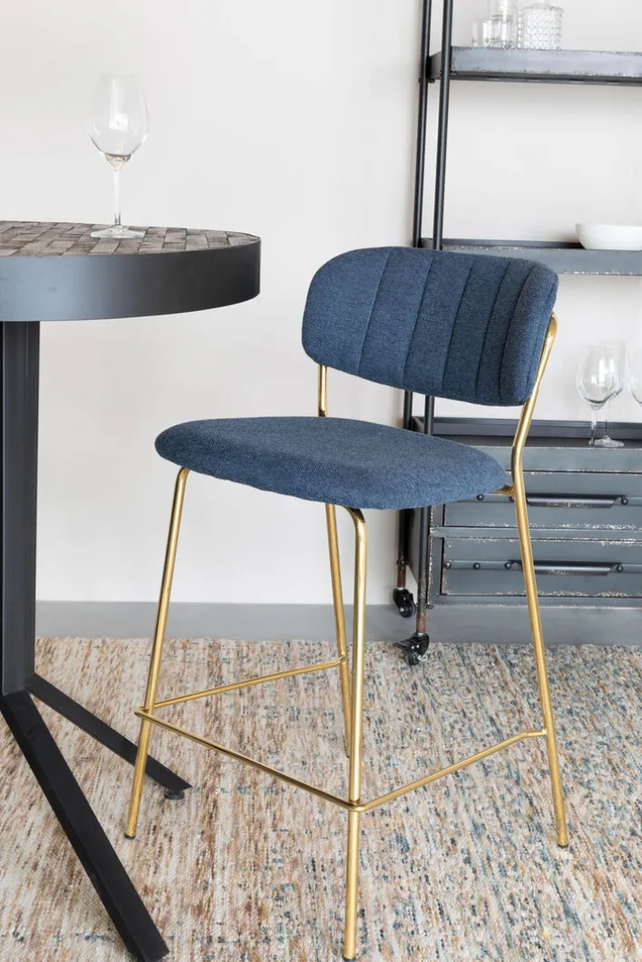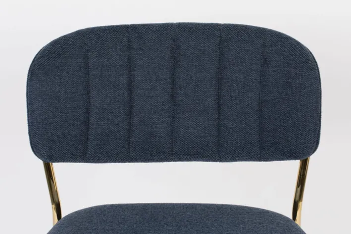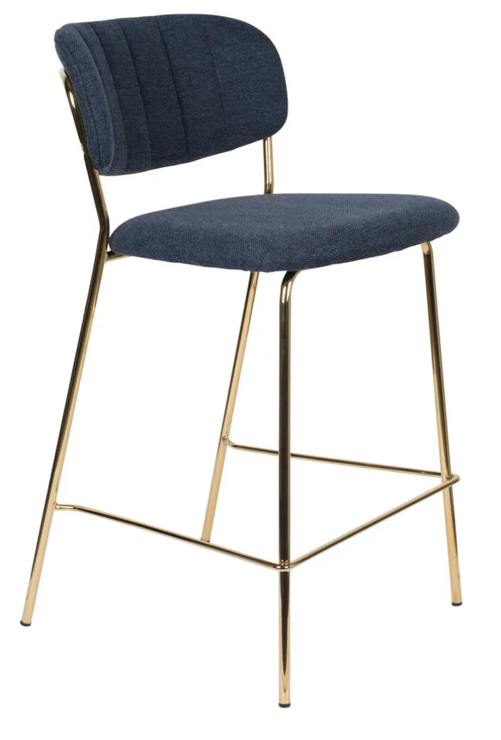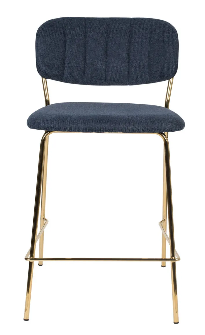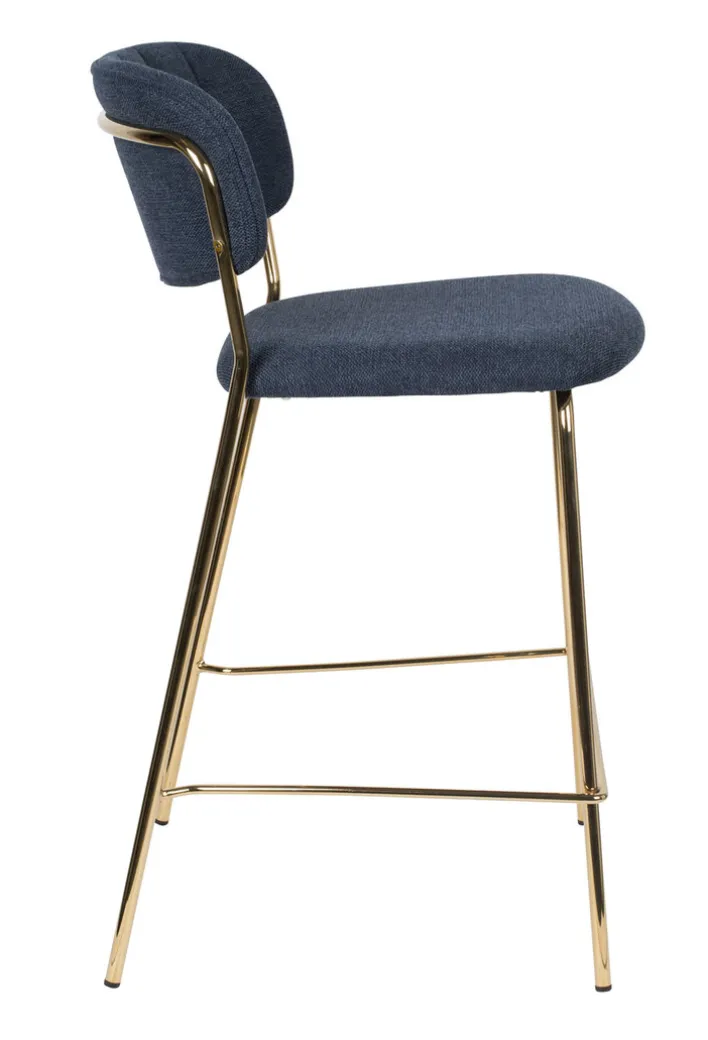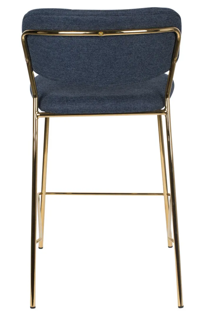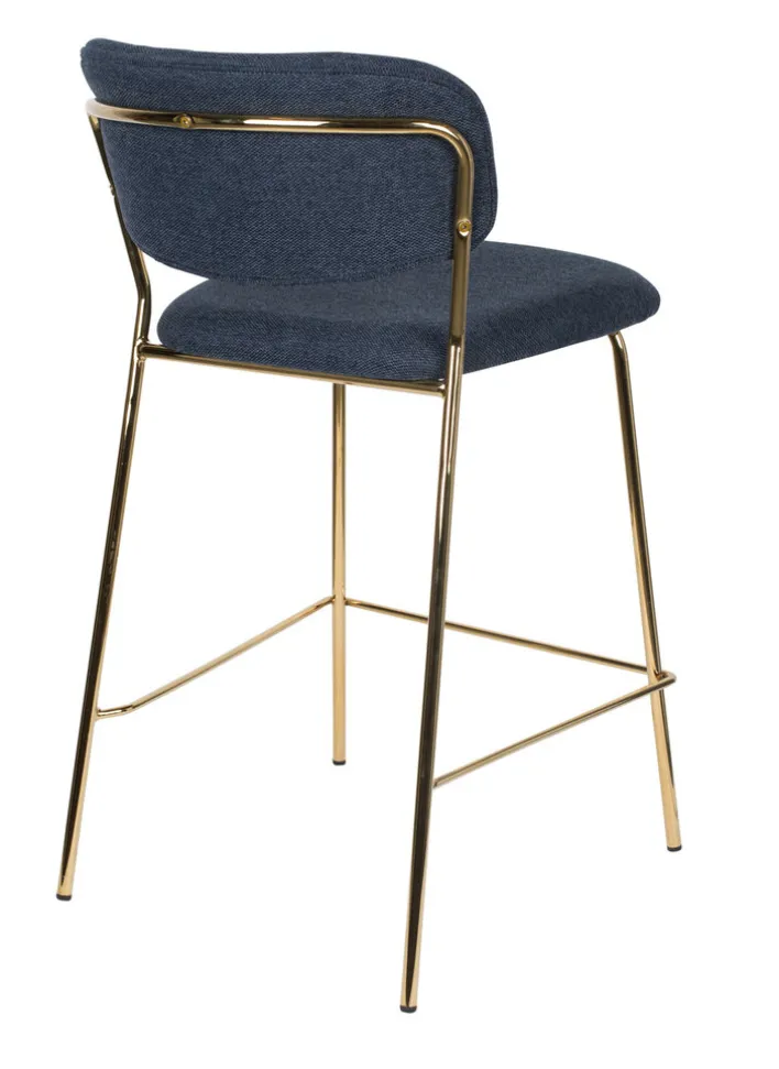 Der Barstuhl JOLIEN besteht aus einem robusten Vierfußgestell aus goldfarbigen pulverbeschichtetem Metall und einer zweigeteilten Sitzfläche und Rückenlehne. Bezogen mit einem pflegeleichten Textil aus 95% Polyester und 5% Nylon ist der noderne Barstuhl strapazierfähig, während die PUR-Schaum Polsterung auch bei längerem Sitzen für Komfort sorgt. Der hohe Sitzkomfort wird von der niedrigen, runden und leicht schräg gestellten Rückenlehne perfektioniert. Außerdem ist der Barstuhl mit einer Fußbank zum bequemen Abstellen der Füße ausgestattet.“