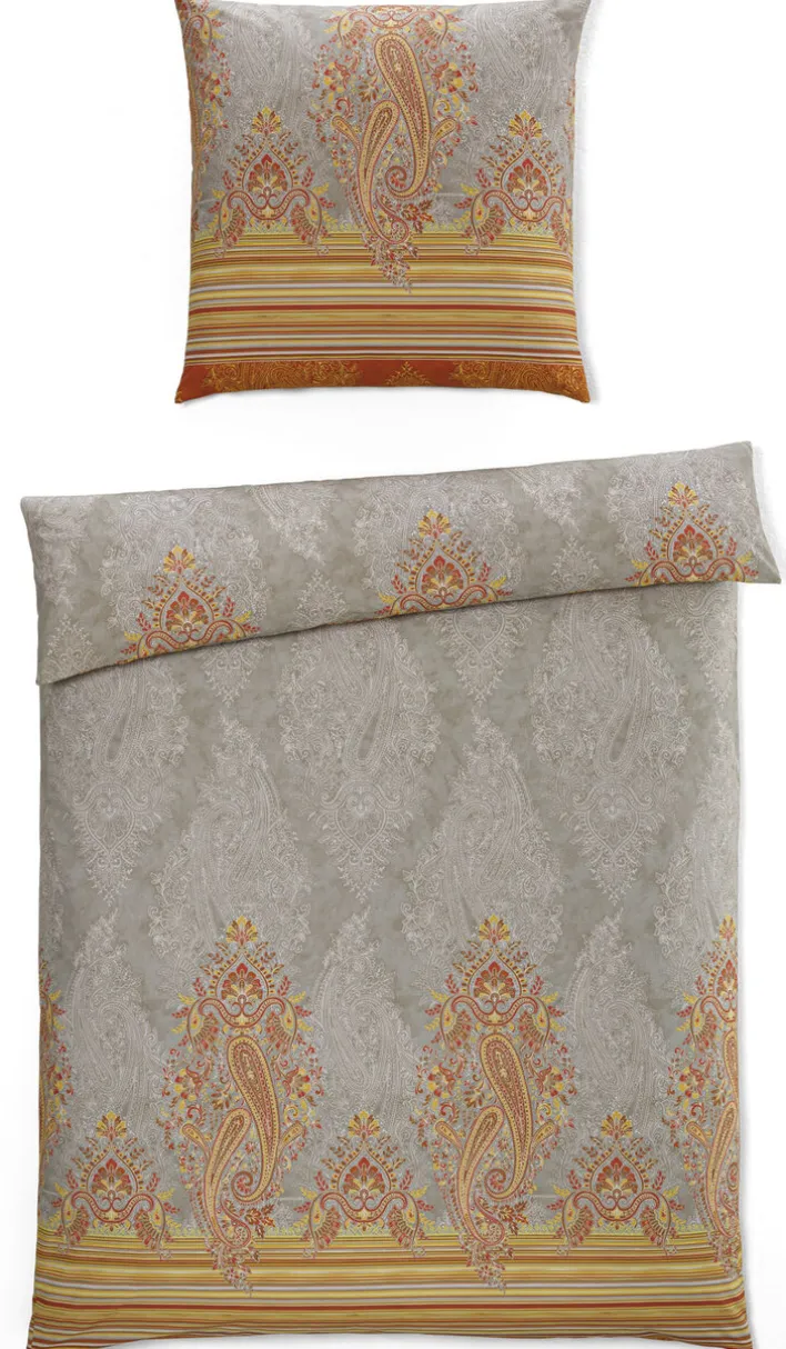Die Mako-Satin-Bettwäsche ELBA V.G1 von bassetti fasziniert in der Farbe Grau mit einem Muster, das in den Tönen Orange und Gelb gestaltet ist. Der Bettbezug hat die Maße 135 Zentimeter Breite und 200 Zentimeter Länge, während der Bezug für das Kissen standardmäßig 80 Zentimeter breit sowie lang ist.