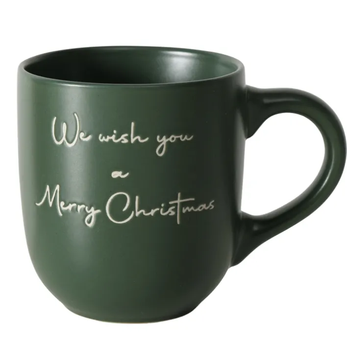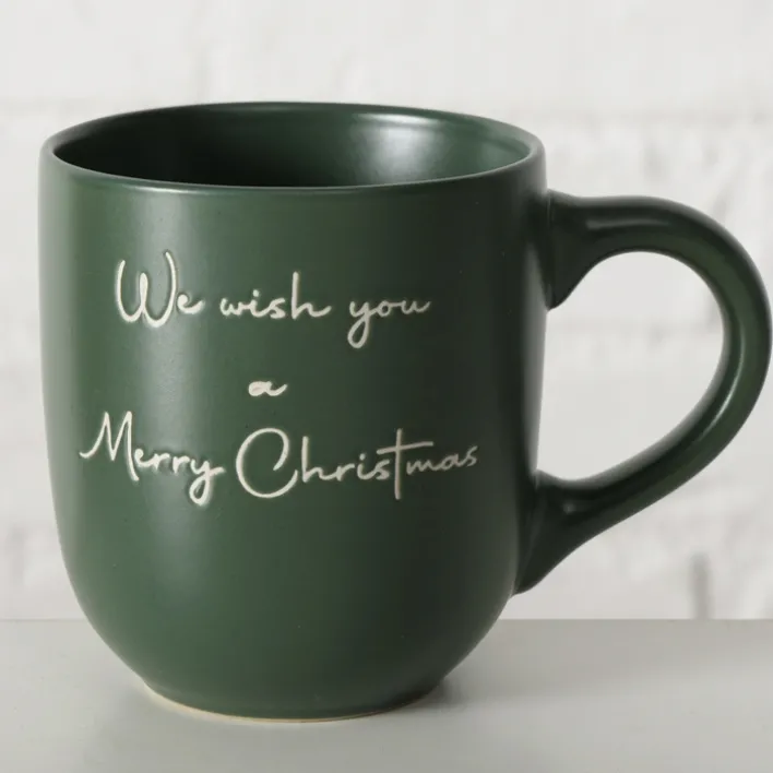 Dieser Becher besteht aus grünem Steinzeug und verfügt über ein Fassungsvermögen von 300 ml. Die Oberfläche zeigt eine matte Optik und ist gleichmäßig in einem dunklen Grünton gehalten. Auf der Vorderseite befindet sich ein kontrastreicher, heller Schriftzug mit dem Text „We wish you a Merry Christmas“, der direkt in das Material eingearbeitet ist. Die Form ist rund mit einem klassischen Henkel, die Maße betragen jeweils 8,3 cm in Tiefe, Breite und Durchmesser sowie 9,5 cm in der Höhe. Der Becher ist für den Einsatz im Innenbereich geeignet und liegt durch die ergonomische Gestaltung des Henkels angenehm in der Hand. Das Material Keramik sorgt für eine robuste und langlebige Qualität. Die dezente Farbgestaltung und der saisonale Schriftzug machen diesen Becher besonders passend für festliche Anlässe in der Winterzeit.