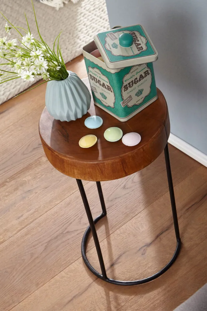 Der runde, 28 x 45 cm große Beistelltisch Sheesham ist ein auffälliges Schmuckstück, das jeden Wohnraum ziert. Wenngleich er als praktische Ablage dient, setzt er sich auch als Solokünstler perfekt in Szene.