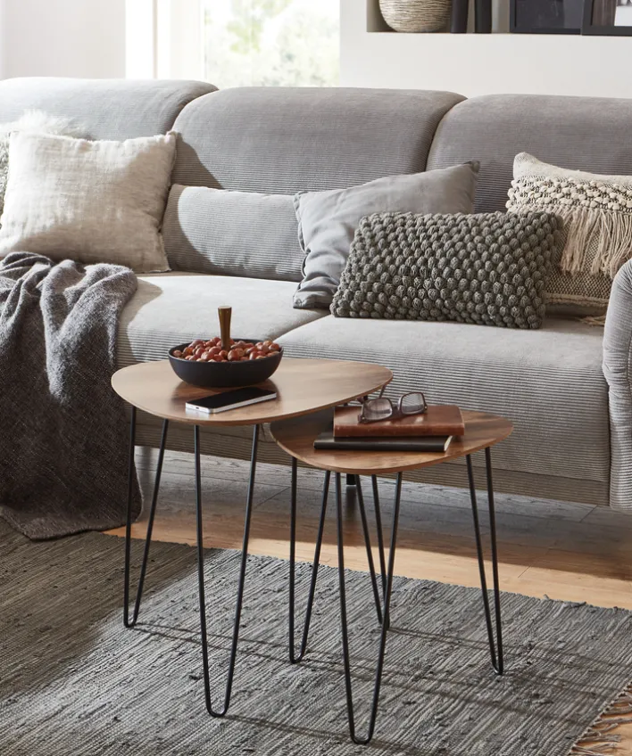 Die Tische aus dem Beistelltisch 2er-Set lassen sich entweder getrennt voneinander, nebeneinander oder teilweise versetzt untereinander nutzen. Damit ist zugleich für eine persönliche Handschrift gesorgt. Sie passen wunderbar vor das Sofa oder andere Wohnlandschaften, könnten aber auch in der Nähe der Fenster schöne Grünpflanzen präsentieren. Die besondere Form der Tischbeine kreiert dabei einen weiteren Blickfang.
