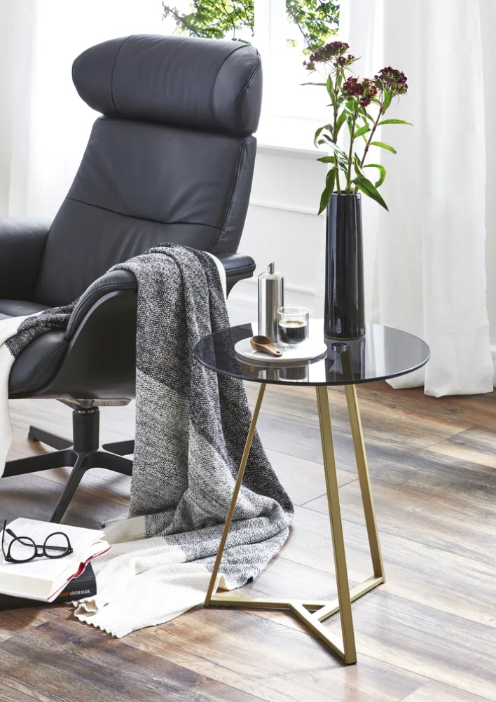 Die Tischplatte von diesem runden Beistelltisch in Grau/Goldfarbig wurde aus Sicherheitsglas angefertigt und in einem Grauton überzogen. Dadurch ist weiterhin ein uneingeschränkter Blick auf das schöne Gestell möglich, während die robuste Tischplatte zudem eine sichere Ablagefläche für Snacks, Getränke und allerlei andere kleine Sachen anbietet.