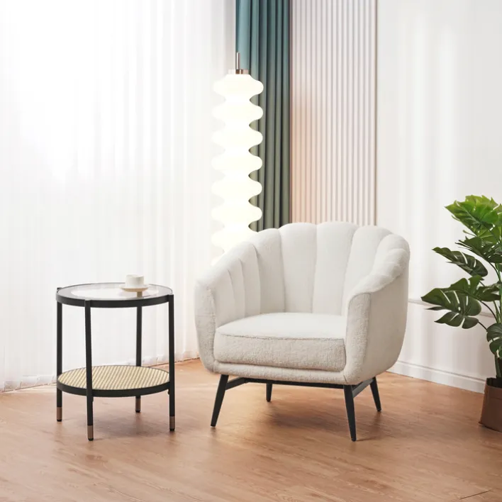 Der schwarz-, braun- und goldfarbige Beistelltisch beweist seine vielseitigen Einsatzmöglichkeiten im Wohnzimmer, Schlafzimmer, Gästezimmer und Flur. Wo immer eine Nische frei ist oder eine praktische Ablagemöglichkeit benötigt wird, findet der runde Beistelltisch mit einer Ebene aus MDF in Rattan-Optik und einer transparenten Tischplatte aus gehärtetem Glas Platz. Das markante Vierfußgestell aus pulverbeschichtetem Metall verleiht dem 46 cm breiten, 55 cm hohen und 46 cm langen Tisch hohe Standfestigkeit. Aufgrund seiner handlichen Größe lässt sich der stabile Beistelltisch leicht umstellen.