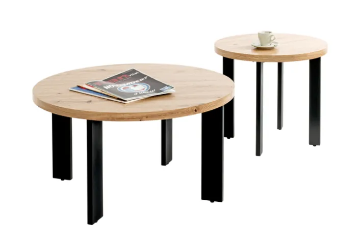 Der 50 cm tiefe und 46 cm hohe Beistelltisch besteht aus einem Vierfußgestell aus schwarzfarbigem Metall und einer runden Tischplatte aus braunfarbiger Holznachbildung. Dank seiner kompakten Abmessungen lässt er sich praktisch überall dort platzieren, wo er benötigt wird.