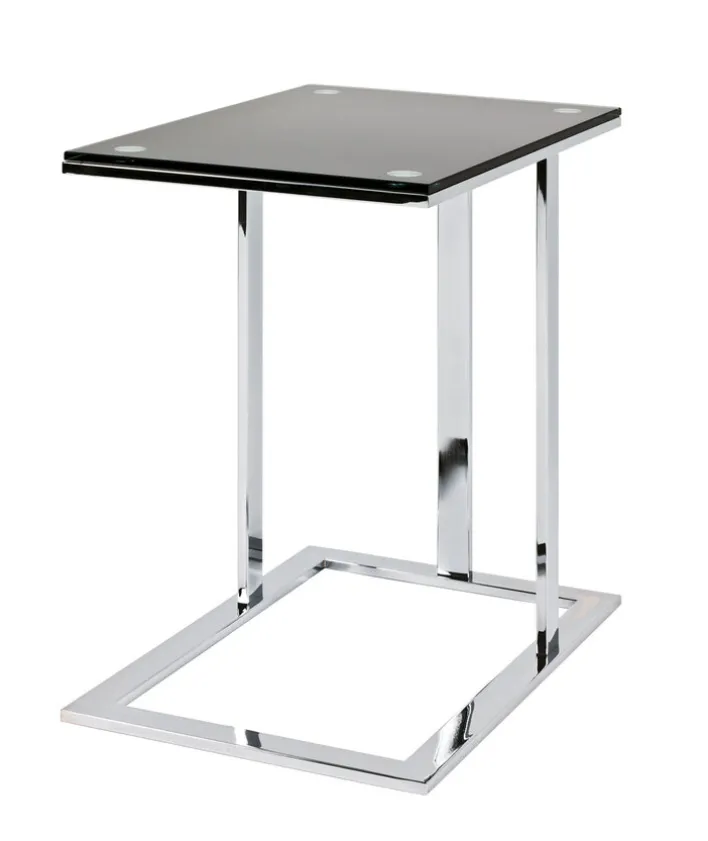 Der 54 x 37 cm große Beistelltisch strahlt mit der Kombination aus Chromfarbig / Schwarz moderne Eleganz aus. Punkten kann der Tisch außerdem mit einem Gestell, das sich besonders nah an Couch und Sessel heranziehen lässt.