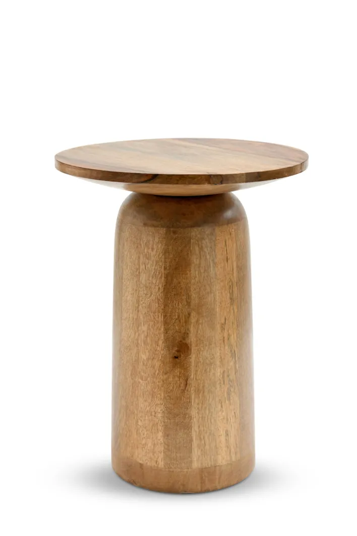 Der Beistelltisch aus der Serie CALM & COSY präsentiert sich mit einer kompakten Größe von 35 cm Breite und Tiefe sowie einer Höhe von 45 cm. Das Gewicht beträgt 7,6 kg. Die runde Tischplatte und das zylindrische Untergestell sind in einer warmen, natürlichen Braun-Nuance gehalten und zeigen die charakteristische Holzmaserung von Mango. Die Oberfläche weist eine glatte, leicht matte Struktur auf, die den natürlichen Holzcharakter unterstützt. Die Optik wirkt durch die klare Linienführung und das massive Design modern und zurückhaltend.
