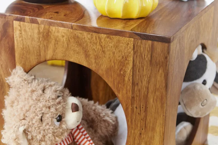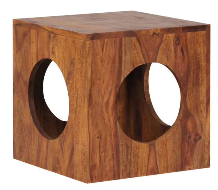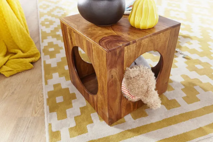 Der 35 x 35 cm große Beistelltisch MUMBAI aus Sheesham Massiv-Holz ist mit seinem außergewöhnlichen Design ein spannender Blickfang für viele Wohnräume.