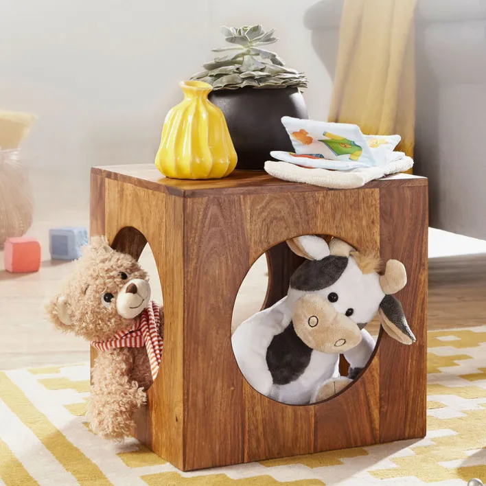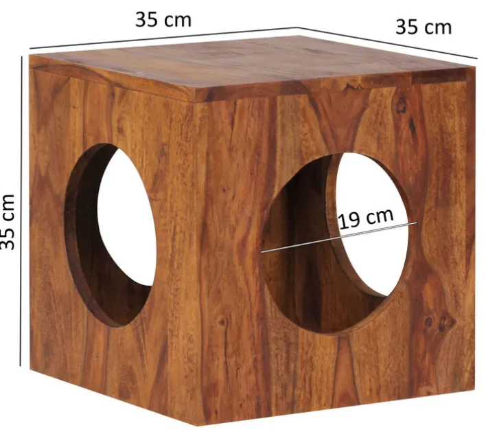 Der quadratische Beistelltisch MUMBAI besteht aus gebeiztem Sheesham Massivholz. Durch die Fertigung von Hand können Farbabweichungen und Unebenheiten auftreten, die aus jedem Tisch ein Unikat machen. Der Beistelltisch ist vielseitig verwendbar und dient als Ablage oder Pflanzenhocker. Die kompakte Größe von 35 x 35 x 35 cm macht aus dem Tischchen außerdem eine praktische Ablage für Ecken. Durch die vier runden Löcher an den Seiten ist der Innenraum des Beistelltisches zu erreichen, der zusätzlichen Stauraum bietet.
