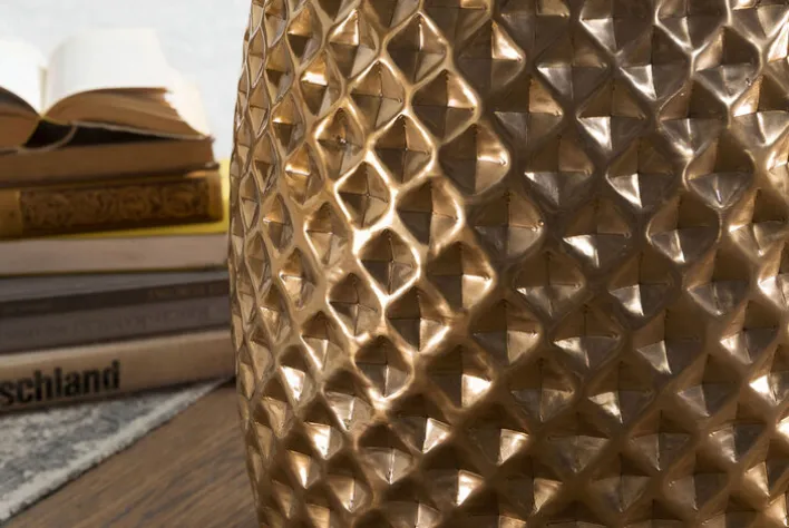 Der goldfarbige Beistelltisch fügt sich überall gut ein, wo ein wohnliches Ambiente das Ziel ist. Das gilt natürlich in erster Linie für Wohnzimmer, in denen 0815-Designs keine allzu guten Karten haben. Nach unten hin verbreitert sich der Korpus etwas, sodass die Hammerschlag-Optik bestens zur Geltung kommt. Da das gute Stück aus Aluminium gearbeitet ist, macht es nichts, wenn mal ein Glas umkippen sollte. In diesem Fall genügt der Griff zum Putzlappen und alles ist wieder gut.