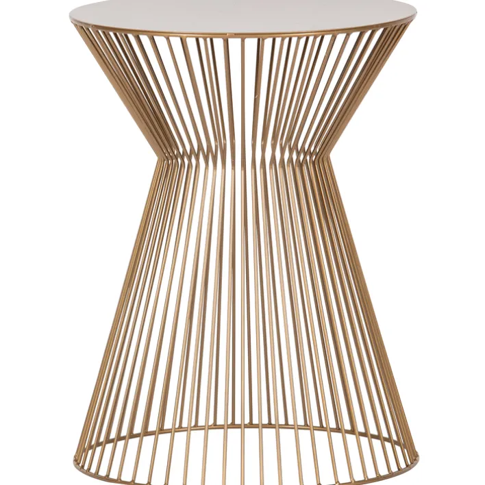 Der goldfarbige SUUS Beistelltisch vereint auf einem Durchmesser von 35 cm eine kreative Formsprache mit modernen Elementen des Industrial- und Art-Deco-Stils. Gleichermaßen ist der kompakte Tisch, dank seiner drahtigen Silhouette, ein echtes Leichtgewicht und flexibel einsetzbar – beispielsweise freistehend oder in der Nähe des Lieblingssessels beziehungsweise Sofas.