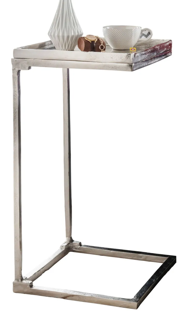 Der praktische Beistelltisch hat einen erhöhten Rand und ist aus Aluminium mit PVD beschichteter Oberfläche gefertigt. Die an einer Seite offene Form erlaubt es, den Fuß des Tisches unter die Couch zu schieben. So sind auf der Tischplatte abgestellte Speisen und Getränke bequem erreichbar. Auch für ein gemütliches Frühstück im Bett kann der Beistelltisch TABLETT verwendet werden.