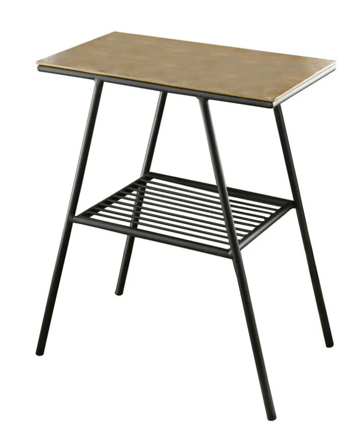 Das Gestell des Beistelltischs VICTORY ist aus mattem, schwarzem Aluminium gefertigt und bekommt durch die trapezförmig angeordneten Beine einen dynamischen Look. Auf dem rustikal anmutenden Gitter im unteren Bereich können beispielsweise Aufbewahrungsboxen oder eine kuschelige Wohndecke Platz finden. Die Oberfläche stellt mit ihrem goldfarbigen Glanz das Highlight des Tisches dar. Hier empfiehlt sich eine sparsame Dekoration mit transparenten Vasen oder Schalen, aktuellem Lesestoff oder einem Teller mit Süßigkeiten oder Gebäck.
