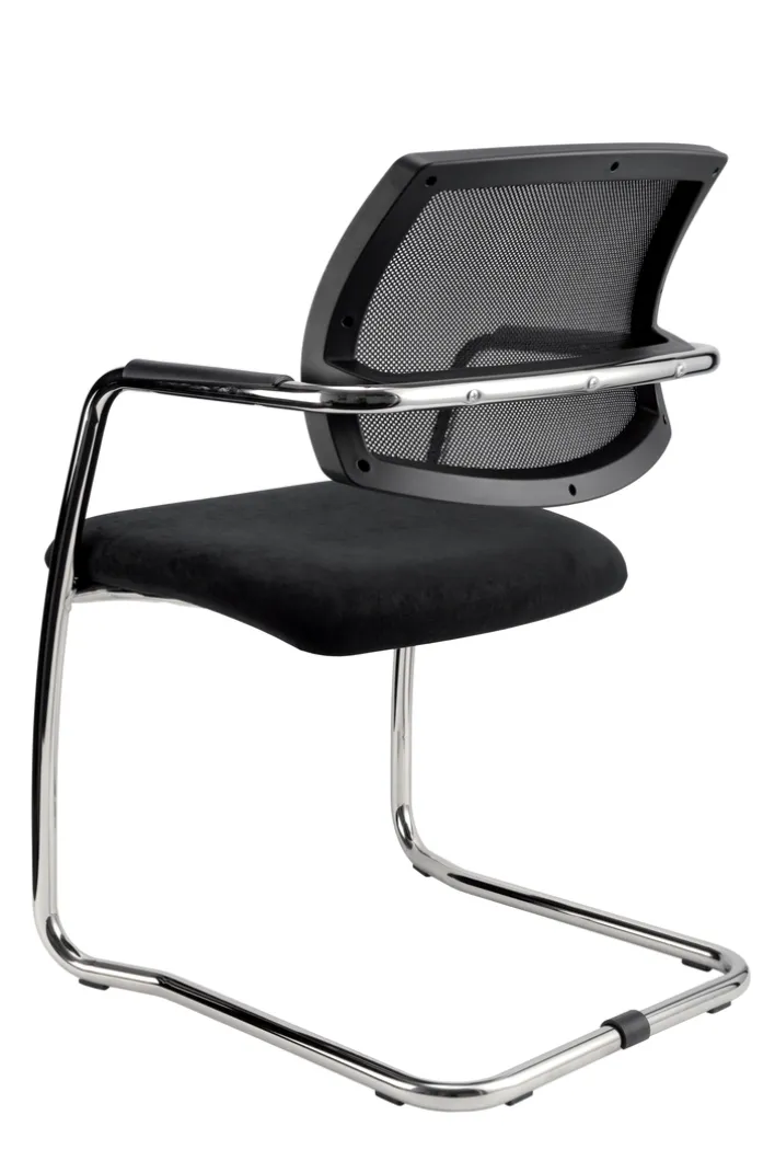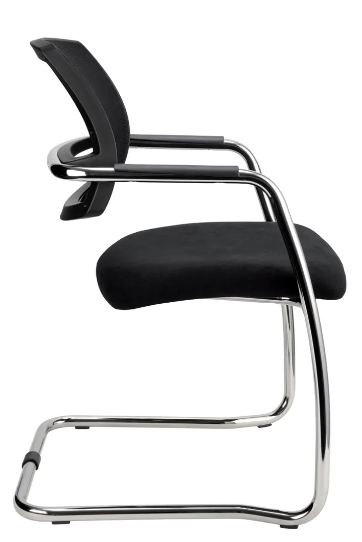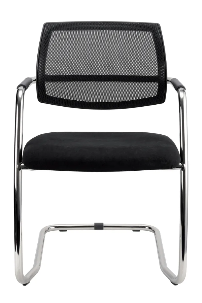 Dieser Besucherstuhl wird im 2er-Set geliefert. Er ist 56 cm breit und 81 cm hoch. Seine Tiefe liegt bei 59 cm. Der Stoffbezug sowie der Netzrücken sind schwarz. Das verchromte Alu-Gestell zeigt sich als Schwinggestell. Die maximale Belastbarkeit beträgt 120 kg.