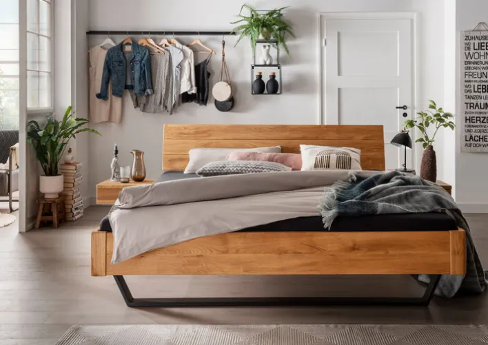Das Bett ist aus massiver Wildeiche geölt gefertigt. Die Gesamtbreite beträgt 205 cm, die Gesamtlänge 220 cm und die Kopfteilhöhe 87 cm. Dabei wiegt es nur 56 Kilogramm. Die auffällige Maserung des Gestells passt hervorragend zu massiven Holzmöbeln, aber ebenso zu metallischen Accessoires in Schlaf- oder Gästezimmer. Beim Schrank besteht die Wahl zwischen dunklem und naturfarbenem Material. Beides harmoniert mit diesem attraktiven Gestell.