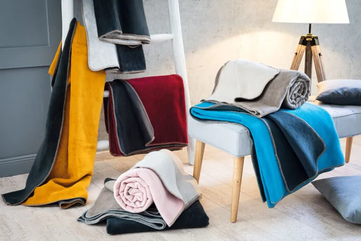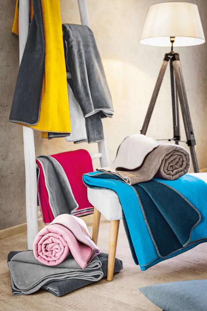 Das fein gewebte Textil für das Wende-Wohnplaid besteht aus Baumwolle, Polyacryl und Polyester. Die Seiten der Decke sind aufwendig eingefasst und mit auffälligen Overlook-Stichen umgenäht. Das schöne Plaid ist bei 30 °C in der Maschine waschbar.