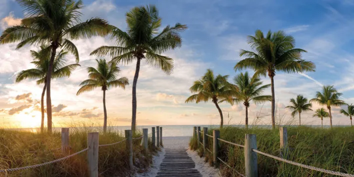 Das Wandbild zeigt eine Panoramaaufnahme eines sandigen Weges, der von Holzpfosten und Seilen gesäumt ist und durch hohe Gräser direkt zu einem Strand mit Palmen führt. Im Hintergrund ist das Meer zu sehen, während am Himmel zarte Wolken und ein Sonnenuntergang für eine warme, natürliche Lichtstimmung sorgen. Die lebendigen Farben der Palmenblätter, des Himmels und des Strandes unterstreichen das mehrfarbige Design des Bildmotivs. Die Oberfläche besteht aus Leinwand, die auf einer mitteldichten Faserplatte (MDF) aufgebracht ist. Mit einer rechteckigen Form und den Maßen 100 cm Höhe und 50 cm Breite eignet sich das Bild für den Innenbereich. Das Gewicht beträgt 1,68 kg. Das Produkt ist Teil der Serie PALMEN und stammt von BÖNNINGHOFF.