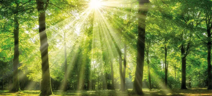 Das Wandbild aus der Serie WALD zeigt ein naturgetreues Fotomotiv eines lichten Waldes mit Sonnenstrahlen, die durch das dichte grüne Blätterdach auf den Waldboden fallen. Das Bild ist in einem rechteckigen Format mit den Maßen 90 cm Breite und 200 cm Höhe gestaltet. Die Farbgebung ist überwiegend grün mit verschiedenen natürlichen Farbtönen, die durch das Sonnenlicht lebendig wirken. Die Textiloberfläche in Leinwandoptik sorgt für eine hochwertige Anmutung und unterstreicht die naturinspirierte Bildwirkung.