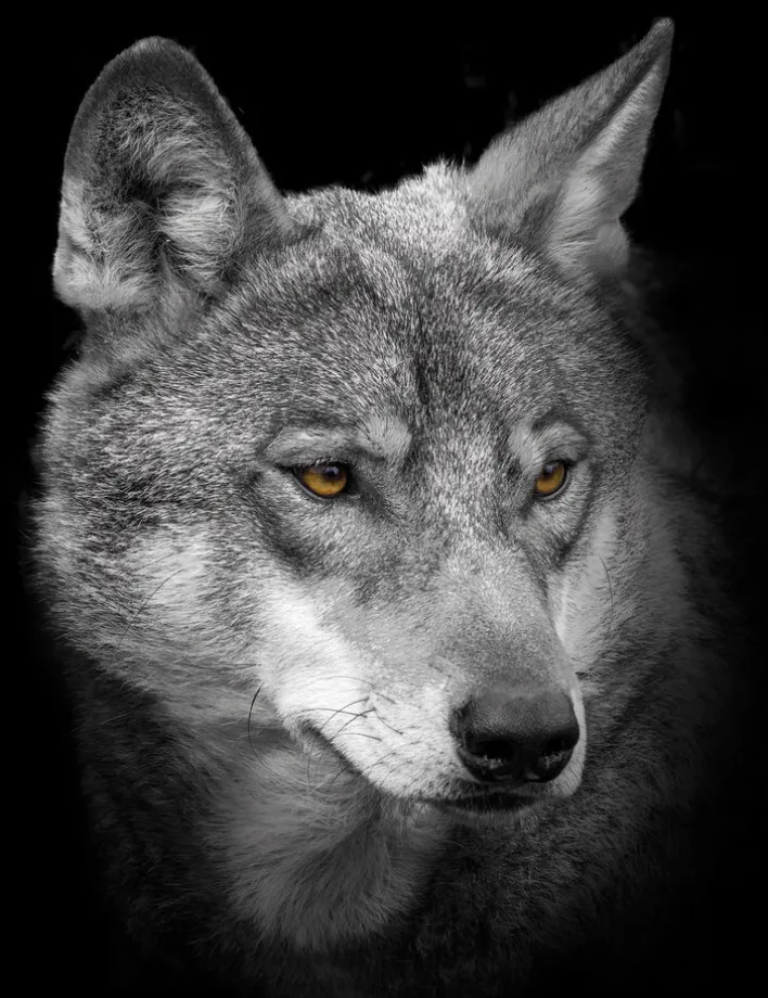 Das Wandbild zeigt das realistische Porträt eines Wolfs in Nahaufnahme. Die Darstellung ist in Graustufen gehalten, wobei die Augen des Tieres in einem auffälligen Gelbton hervorstechen. Die Bildkomposition konzentriert sich auf den Kopf und das dichte Fell des Wolfs, die Details der Fellstruktur sind klar erkennbar. Der Hintergrund ist vollständig schwarz, wodurch das Motiv deutlich im Vordergrund steht und eine ruhige, konzentrierte Wirkung entsteht.