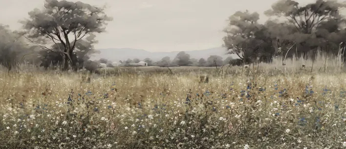 Das Bild zeigt eine malerische Wiesenlandschaft mit blühenden Blumen und Bäumen im Hintergrund. Die Farbpalette ist mehrfarbig, mit sanften Erdtönen und dezenten Blau- und Weißakzenten, die eine beruhigende Atmosphäre schaffen. Das Material aus Holz verleiht dem Bild eine natürliche und hochwertige Anmutung. Dieses Kunstwerk ist nicht nur ein dekoratives Element, sondern auch ein Ausdruck von Stil und Eleganz.