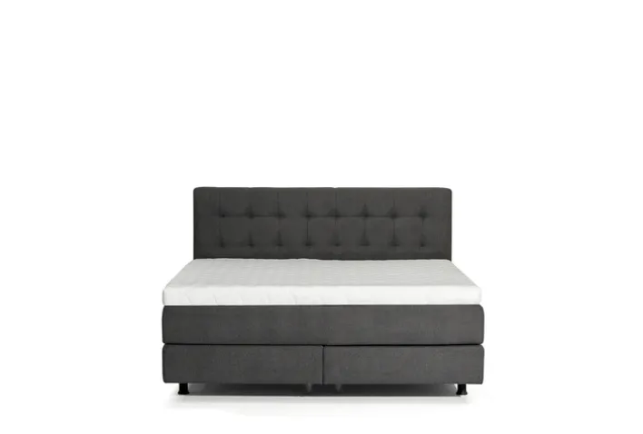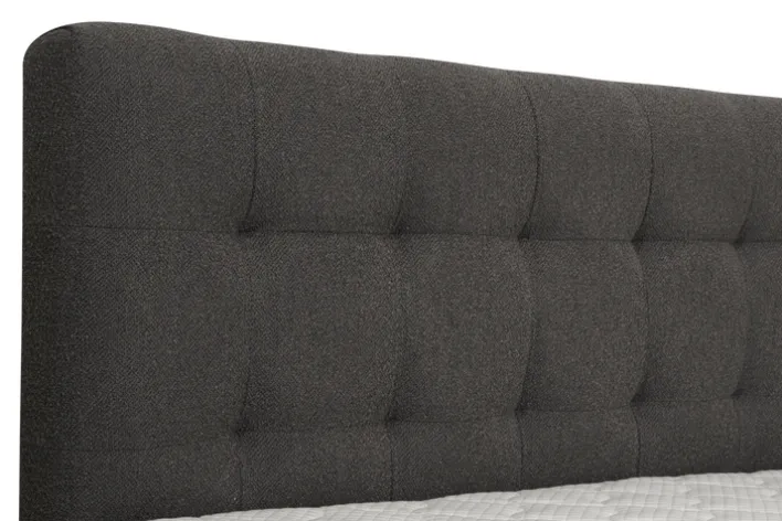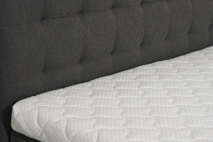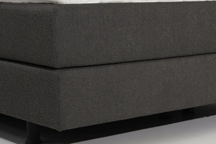 Dieses Boxspringbett aus der Serie SIENNA bietet eine Liegefläche von 180 x 200 cm und zeichnet sich durch einen Bezug in Teddy Anthrazit aus. Das gepolsterte Kopfteil ist 120 cm hoch und verfügt über eine gleichmäßige Steppung, die für eine dezente, strukturierte Optik sorgt. Die Kombination aus grauer und schwarzer Farbgebung prägt das moderne, zurückhaltende Design. Die sichtbare Textiloberfläche besteht aus 100 % Polyester-Synthetikfaser und wirkt weich sowie gleichmäßig strukturiert, während der weiße Topper einen klaren Kontrast zur dunklen Basis bildet.