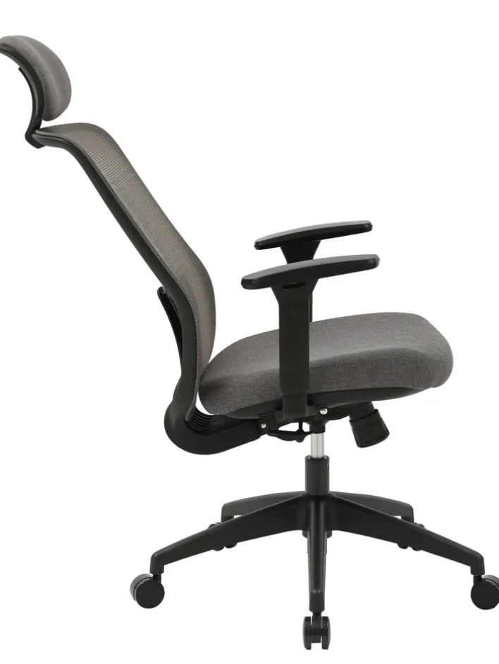 Der Bürostuhl „Maya“ vereint modernes Design mit funktionaler Ergonomie. Der Stuhl ist in einem eleganten Grau gehalten, das durch den Stoffbezug und das schwarze Gestell harmonisch ergänzt wird. Die Sitzfläche und die Kopfstütze sind mit einem strapazierfähigen Textil aus 100% Polyester bezogen, während die Rückenlehne aus atmungsaktivem Mesh-Material besteht, das für optimalen Komfort sorgt. Die Armlehnen und das Fußkreuz sind aus robustem Kunststoff gefertigt, was dem Stuhl Stabilität und Langlebigkeit verleiht.