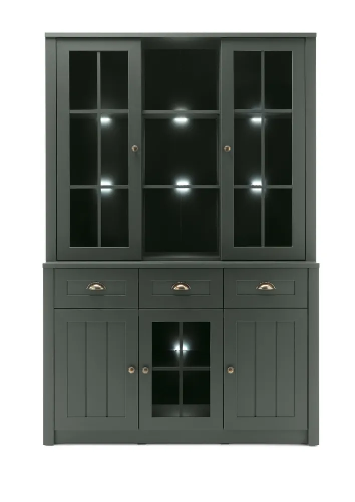 Der in den Farben Grün und Gold designte Buffetschrank ASCOT passt mit den Maßen 130 Zentimeter Breite, 196 Zentimeter Höhe und 43 Zentimeter Tiefe in jede Küche. Das Modell überzeug mit viel Stauraum drei Türen mit Glaseinsätzen.