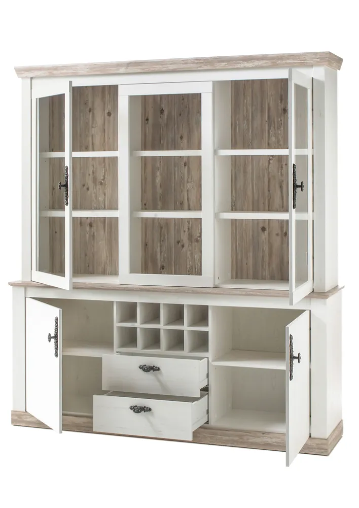 Ob Wohnküche oder Esszimmer: Der große Buffetschrank FLORENZ zieht mit seinem ansprechenden Design den Blick auf sich. Die Applikationen in Pinie-Oslo-Dekor bilden einen stylishen Kontrast zu den weißen Flächen. Im oberen Bereich befinden sich zwei Drehtüren mit Glaseinsatz sowie drei offene Fächer. Hinter den beiden Türen im unteren Bereich stehen je zwei Fächer zur Verfügung. Hinzu kommen zwei geräumige Schubkästen sowie acht Flaschenfächer. Korpus und Fronten sind aus Holznachbildung gefertigt, die Griffe aus Metall.