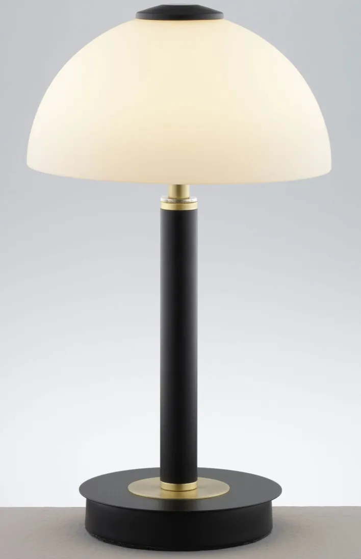 Diese Tischleuchte hat einen Durchmesser von 23 cm. Sie ist mit einem fest eingebauten LED-Leuchtmittel ausgestattet, das einen Höchstverbrauch von 8 Watt sowie eine maximale Lichtleistung von 600 Lumen aufweist; ihre Lichttemperatur beträgt 3.000 Kelvin. Optisch gefällt die Lampe dank ihres Kontrastes aus schwarzem sowie goldfarbigem Metall und weißem Glas. In puncto Bedienung ist hervorzuheben, dass sie über einen 3-Stufen-Touchdimmer verfügt, sodass sie stets für eine angenehme Atmosphäre sorgt.