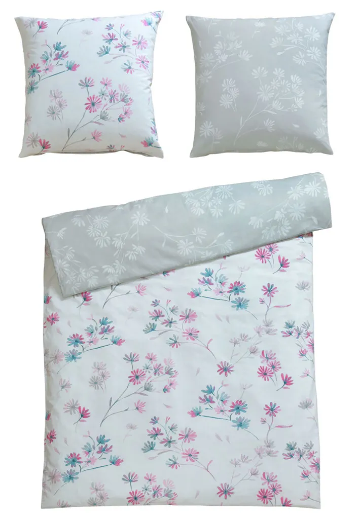Die Renforcé-Bettwäsche BELLA der Marke casaNOVA misst 135 x 220 cm. Ihr elegantes, zeitloses Design in der Hauptfarbe Grau weist florale Elemente in Pink und Blau auf. Dank ihrer Wendeoptik liegen weiße Blumen auf grauem Hintergrund, wenn sie umgedreht wird.