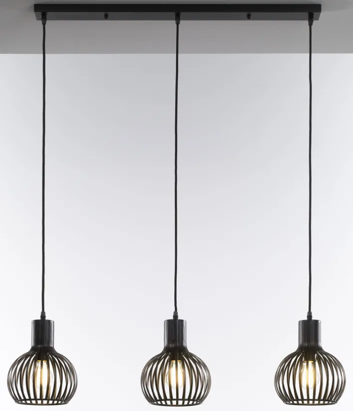 Das casaNOVA Retrofit Balkenpendel COLLIN II ist 94 cm breit und 150 cm hoch. Es ist aus schwarzem Metall, 3-flammig mit trendiger Gitteroptik.