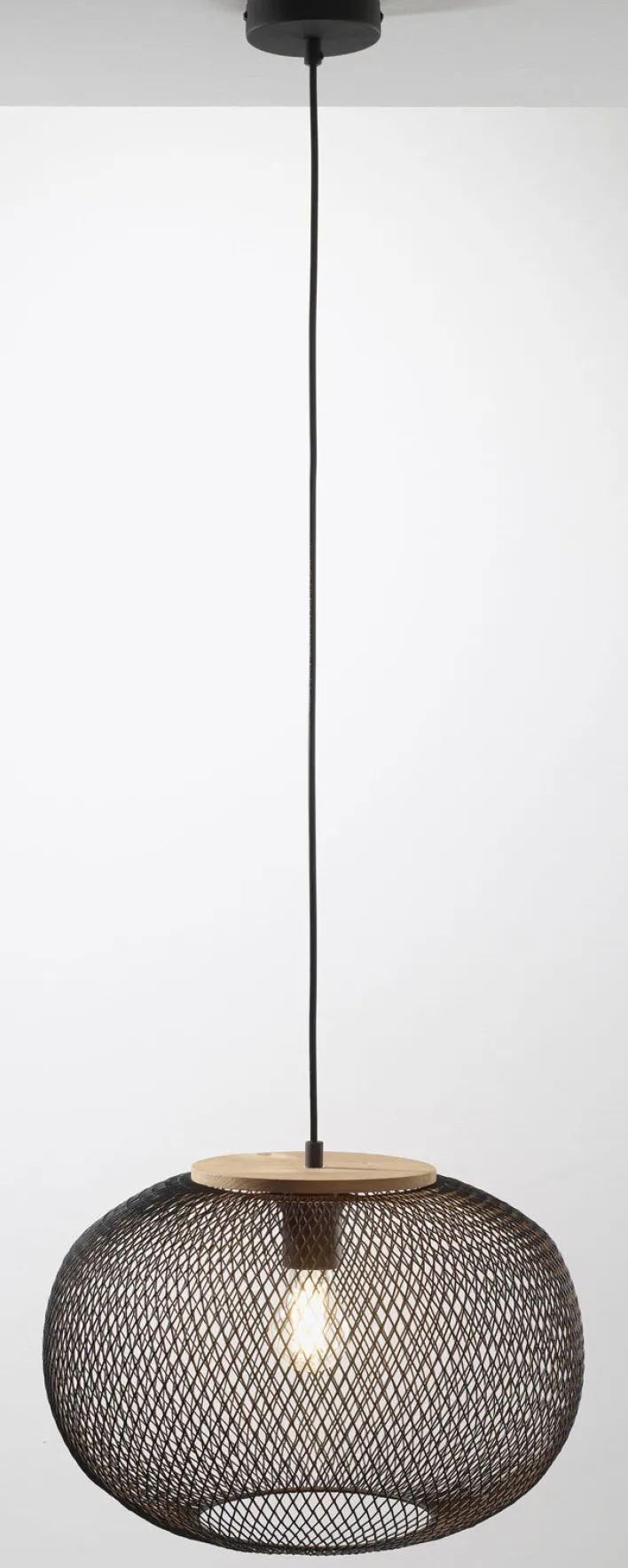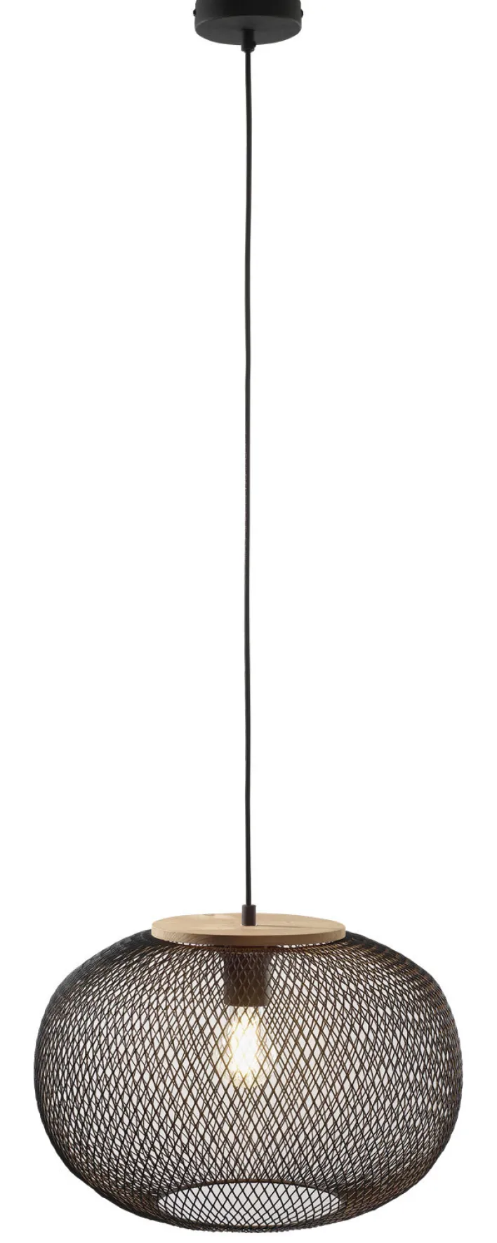 Die casaNOVA Retrofit Pendelleuchte RESI ist 1-flammig. Sie ist in schwarzem Metall und naturfarbigem Holz gestaltet. Zudem wird sie ohne Leuchtmittel geliefert. Ihre runde Gitteroptik wirkt filigran und ist ausgesprochen attraktiv.