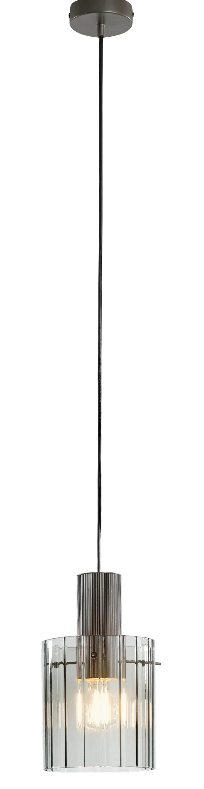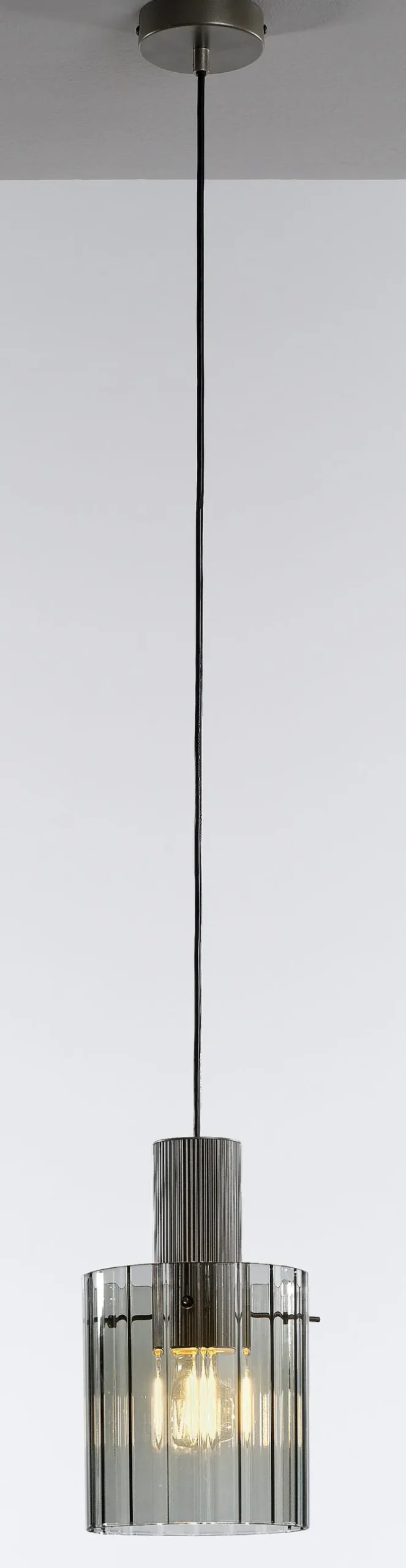 Die 1-flammige casaNOVA Retrofit Pendelleuchte RONJA ist 150 cm hoch, aus Glas, Aluminium und Eisen. Der Lampenschirm aus Rauchglas hat einen Durchmesser von 18 cm.